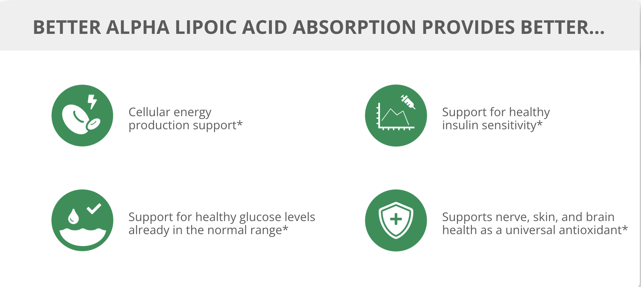 Since the amount of alpha lipoic acid our bodies produce is minuscule, many experts recommend supplementing, particularly if you are exposed to excessive free radicals. Since alpha lipoic acid is both attracted to and repelled by water, absorption from traditional oral supplements in the digestive tract is unreliable. Liposomal alpha lipoic acid wraps the nutrient in phospholipids that transport through the bloodstream to the cells, avoiding the challenges of the gastrointestinal tract and enabling superior absorption.
