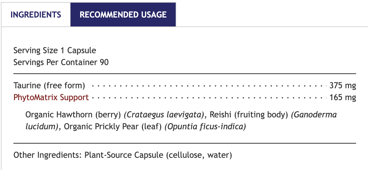 Premier Taurine Blend offers advanced cardiovascular, gallbladder and detoxification support.* This formula features taurine in its free form. The botanical blend, PhytoMatrix Support, is included as a biocompatible herbal support blend for broad spectrum nutritional support.*